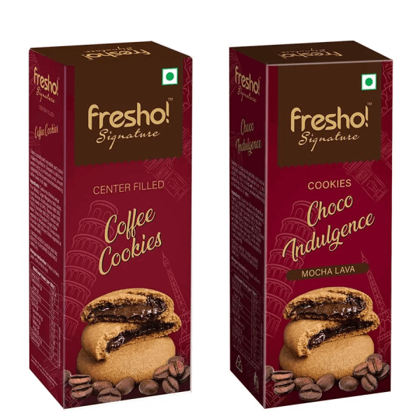 Fresho Signature brings you rich, dark and crunchy chocolate cookies filled with molten, gooey chocolate and coffee creme, baked to perfection.